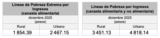 De acuerdo con el INEGI, al 12 de enero de 2026, el valor mensual de la canasta alimentaria por persona se ubica en 2,467.15 pesos en zonas urbanas y 1,854.39 pesos en zonas rurales. Si se considera la línea de pobreza por ingresos, que contempla también bienes y servicios no alimentarios, ésta asciende a 4,818.14 pesos en zonas urbanas y 3,451.13 pesos en zonas rurales, lo cual refleja un nivel de ingreso que millones de mexicanos no logran alcanzar mensualmente.